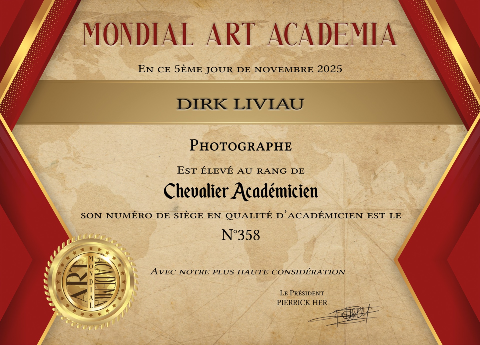 2025 . Dirk Liviau est nommé chevalier des arts artistiques par la Mondial Art Academia ( pour sa contribution innovante à la photographie contemporaine )